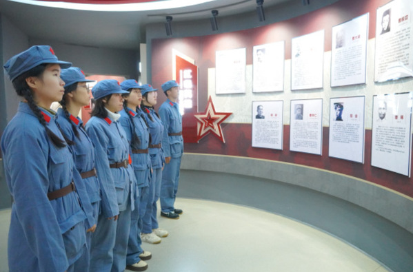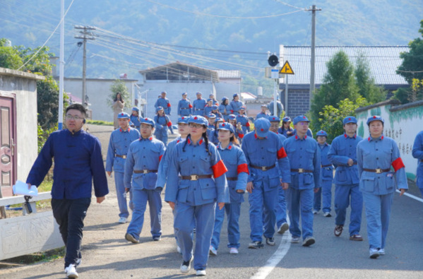活动最后,全体人员前往革命烈士陵园敬献鲜花、默哀致敬。青石板路上,这支特殊的“红军”队伍成为古村一道亮丽的风景。引导员在现场动情讲述隐蔽战线先辈坚守信仰、无畏牺牲的感人事迹,引导同学们深刻感悟革命精神,进一步增强责任意识与历史使命感。
