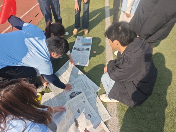 紧张激烈的团队竞赛环节将活动推向白热化高潮。三场精心设计的游戏项目,全方位考验着各队的协作能力、逻辑思维与综合素养:“扑克接力”在激昂的背景音乐中火热开赛,同学们分工明确、默契配合,有的负责记忆卡牌位置,有的负责逻辑推演,有的负责快速翻牌,在紧张刺激的比拼中展现出超强的策略布局与团队协作能力;“一圈到底”伴随着欢快的旋律温馨上演,各队成员手拉手围成紧密的圆圈,通过灵活扭动身体、默契配合传递呼啦圈,欢声笑语中进一步凝聚了团队情谊;“无敌风火轮”则点燃了全场的热情,各队利用报纸和胶带争分夺秒组装“履带”,十位队员同步站入其中,喊着整齐的口号同心协力向前冲刺,报纸“履带”滚动的沙沙声、队员们的呐喊声、现场的加油声交织在一起,成为操场上最动人的旋律,各队在速度与平衡的双重较量中,充分展现了攻坚克难的决心与强大的团队凝聚力。每个项目结束后,现场均设置互动分享环节,同学们踊跃发言,畅谈参与过程中的感悟与收获,在交流中相互启发、共同成长,真正实现了 “在体验中学习,在分享中成长”。