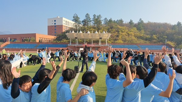 破冰起航环节率先点燃现场氛围。静态热身“时空穿梭”让大家在眼神交汇与轻声交流中打破陌生壁垒,动态热身“爱的拥抱”以温暖互动拉近彼此距离,全员挑战“信任后坐”则让同学们在向后倾倒的瞬间,真切感受团队托举的力量与无条件信任的重量。三个项目层层递进,让原本略带拘谨的同学们逐渐敞开心扉、融入集体,欢声笑语在操场上空久久回荡。