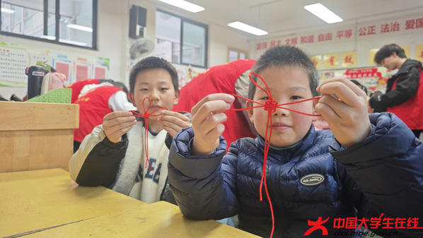 另一边的中国结编织现场同样气氛热烈。志愿者将复杂的编绳步骤拆解为简单易懂的流程,从穿绳、绕线到打结、塑形,一步步耐心引导,手把手帮助孩子们攻克难点。孩子们两两结伴、互相帮助,一个个造型精致、寓意吉祥的中国结渐渐成形,看着自己的作品,孩子们脸上洋溢着成就感。