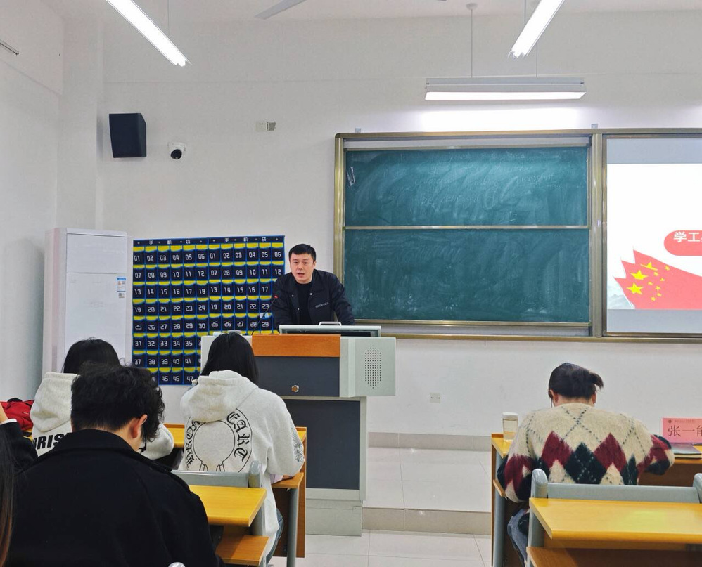 大会伊始,赵卫军书记发表致辞。他以贴近学生的日常小事为切入点,聚焦人身、财产、网络三大安全领域,围绕“安全”与“文明”两大核心,强调安全员队伍是守护学生校园生活的“第一道屏障”,文明班级是学院学风建设的重要载体。并号召全体师生以此次大会为契机,将文明意识融入日常言行、把安全责任落到实处,共同营造和谐、有序、安全的育人环境。随后,学工办负责人张一能对学院安全管理制度进行系统解读,重点聚焦《外国语学院学生宿舍文明养成规定(一二三四)》《外国语学院学生课堂文明“一听五不”诚信承诺书》《外国语学院学生法制安全公约(共计18条)》三大核心文件。他逐一梳理宿舍文明中“每周一查、作息二不、安全三防”等要求,课堂“认真听讲、五不行为”承诺及违约处罚措施,以及法制安全公约里离校请假、防盗防骗、防火用电等18条细则,同时明确辅导员、班长、寝室长的分级安全责任,为安全工作规范化开展提供清晰依据,助力师生精准掌握“守好安全防线”的具体路径。活动进入尾声,学生代表依次上台发言。英语2401班班长王爽爽结合班级日常管理经验,从学风建设、行为规范等角度,阐述了对文明班级创建的思考,并描绘了班级共同进步的美好期待。应用英语2501班生劳委员苏乐代表全体学生承诺,将积极响应学院号召,主动参与文明实践,配合安全员开展工作,以青春力量为校园文明与安全保驾护航。