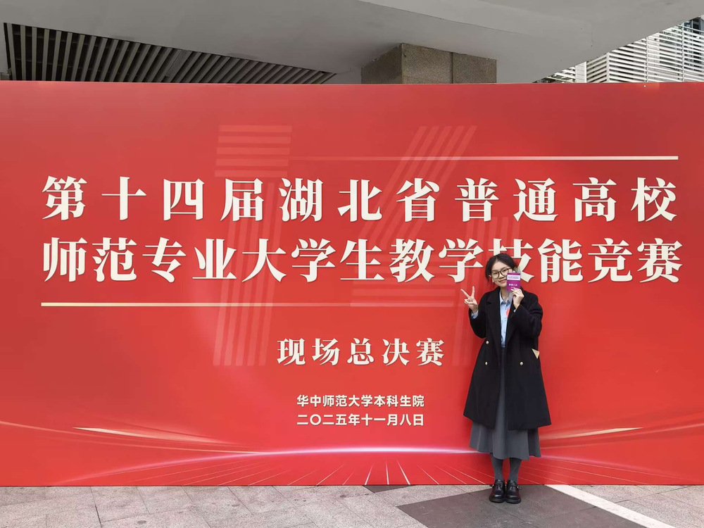 2025年11月8日,第十四届湖北省普通高校师范专业大学生教学技能竞赛决赛在华中师范大学落下帷幕,由外国语学院周莉娜、饶琪两位老师指导的英语专业2202班艾欣林同学在此次决赛中获得高中英语组二等奖。