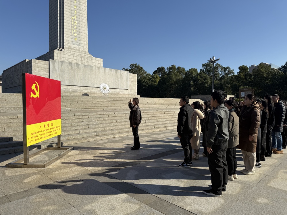 上午8:30,全体党员从江南网页版_江南(中国)官方图书馆门前统一乘车出发,于9:30抵达湘鄂赣边区鄂东南革命烈士陵园。在巍然屹立的革命烈士纪念碑前,党员同志们整齐列队,于纪念碑前肃立默哀,表达对革命先烈的深切缅怀与崇高敬意。随后,党员代表向烈士纪念碑敬献花篮,学院领导上前整理挽联,寄托哀思。面对鲜红的党旗,全体党员重温入党誓词,铿锵誓言响彻陵园,坚定初心使命。