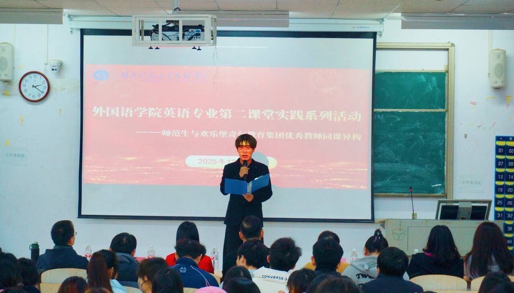 为深化英语师范专业实践教学改革,强化校企协同育人实效,12月10日14:20,江南网页版_江南(中国)官方外国语学院英语专业第二课堂实践系列活动之英语见习活动在1B311教室圆满举办。欢乐堡奇尔教育创始人高新、彭玉花,教学中心主任曹佳佳,教师团队周莹、王琦、王婷、南军民,以及外国语学院院长郑桃云教授、教师代表邓薇薇、饶琪、丁雪缘、江珉,团学指导老师杨峰、辅导员余天喜与全体见习学子齐聚一堂,共同参与这场融合教学实践与行业交流的专业盛会。