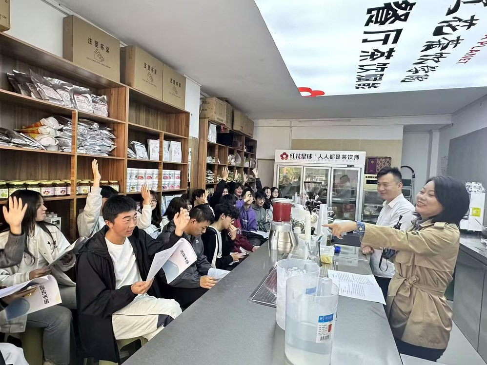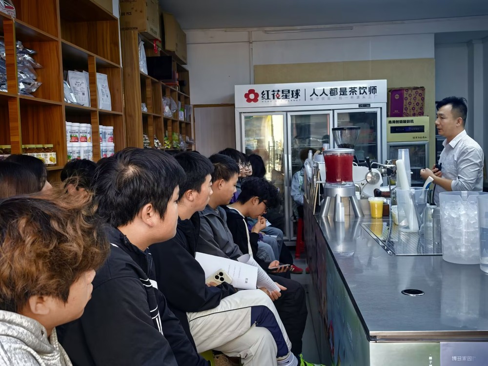 理论结合实践,方能深化认知。在精彩的分享会后,活动进入了沉浸式的实操体验环节。大学生们在张清及专业人员的指导下,分组参与了饮品制作项目。从原料配比到设备操作,同学们亲手实践,在每一个细节中直观感受基层创业的实操流程与核心技巧,现场气氛热烈,成果频现。