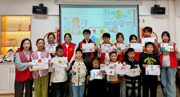 文化润心,更需实践赋能。随后的“大手牵小手”手工活动中,孩子们在志愿者的协助下展开创意绘画。一幅幅稚拙而真诚的作品,勾勒出他们对“孝”与“爱”的理解。活动室内笑语盈盈秋阳透过窗户,为鲜红的党旗镀上一层温暖的光晕,也映衬着志愿者们朝气蓬勃的脸庞