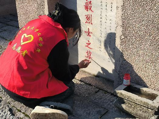 在英山烈士陵园,志愿者们身穿红色马甲,手拿清扫工具,清理了陵园广场前的沙石、落叶、垃圾和夹缝里的杂草。在专业人员的带领下,志愿者开始对墓碑进行描红。志愿者明璇表示,“能让纪念碑闪闪发光的不只是太阳,而是革命烈士英雄的一生,光辉的一生。”描红结束后,志愿者们还参观了英山烈士文物陈列馆。漫步于展厅中,看着墙壁上烈士们的肖像画,听着讲解员诉说的故事,志愿者心潮澎拜:革命先烈为人民解放抛头颅、洒热血,我辈当为民族复兴为已任、当力行。