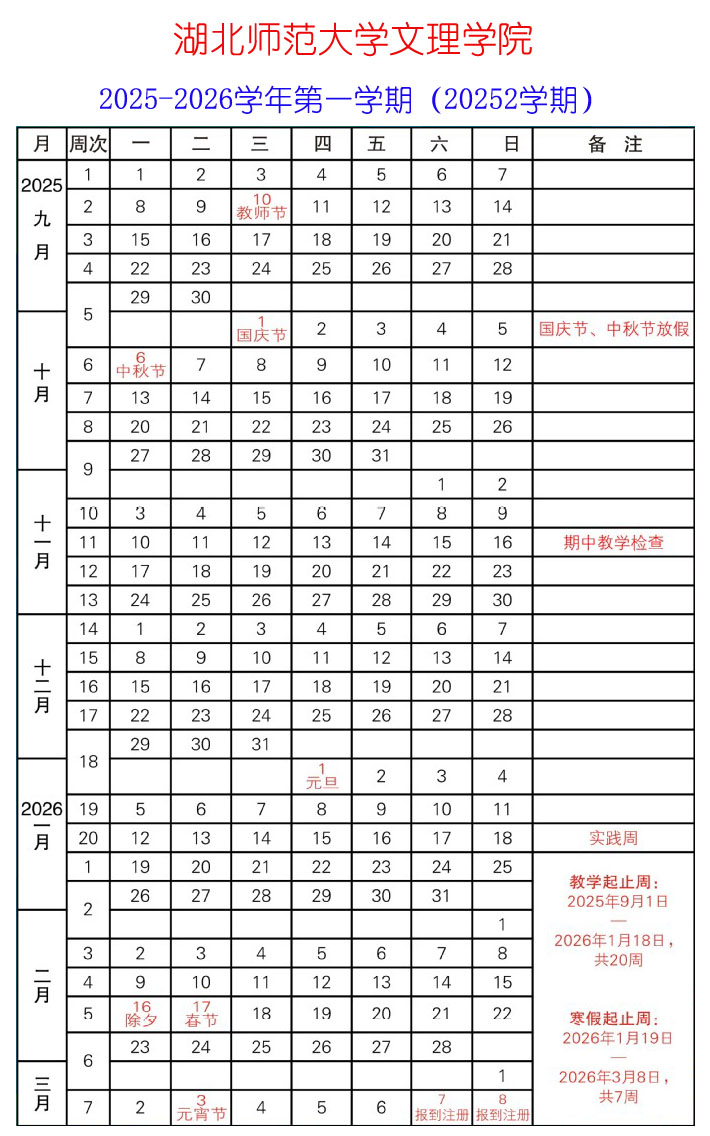 文理学院校历(20252学期)