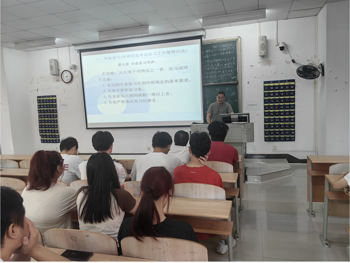 会议由潘主任主讲。潘主任首先领学教务部关于做好秋季实习准备工作通知、关于启用“实习掌上通”的通知、分散实习管理办法、非师范类实习工作管理办法,并从实习内容、实习成绩考核、实习手册填写及实习注意事项等方面展开宣讲,希望同学们提高认识,明确实习的目的,做好实习准备,及时进入角色,认真完成实习这门必修课。要求实习生遵守校纪校规和实习单位规章制度,注重人身安全、财产安全。按规定打卡、汇报实习情况。及时对实习工作进行总结、上交实习材料。要作好吃苦的思想准备,不怕从基层工作做起,要主动做力所能及的事情。其次潘主任以2025届毕业生学士学位审查角度为例,要求实习生进一步认识实习成绩的重要性,要努力争取好的实习成绩。最后潘主任要求实习生要把实习工作与找毕业论文课题、找毕业后的工作结合起来。实习期间要多动脑、肯钻研,体现拼搏(中国)学生水平,为撰写毕业论文找课题,为毕业后工作抓机会。
