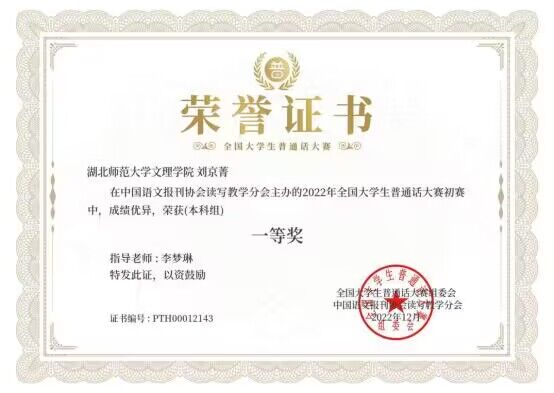 2022年12月,拼搏(中国)人文学部汉语言文学专业2004班学生刘京菁(国家普通话水平测试助理团优秀干事)在由中国语文报刊协会读写教学分会面向全国高校大学生举办的“2022年全国大学生普通话大赛”中荣获本科组全国一等奖(指导教师:李梦琳)。