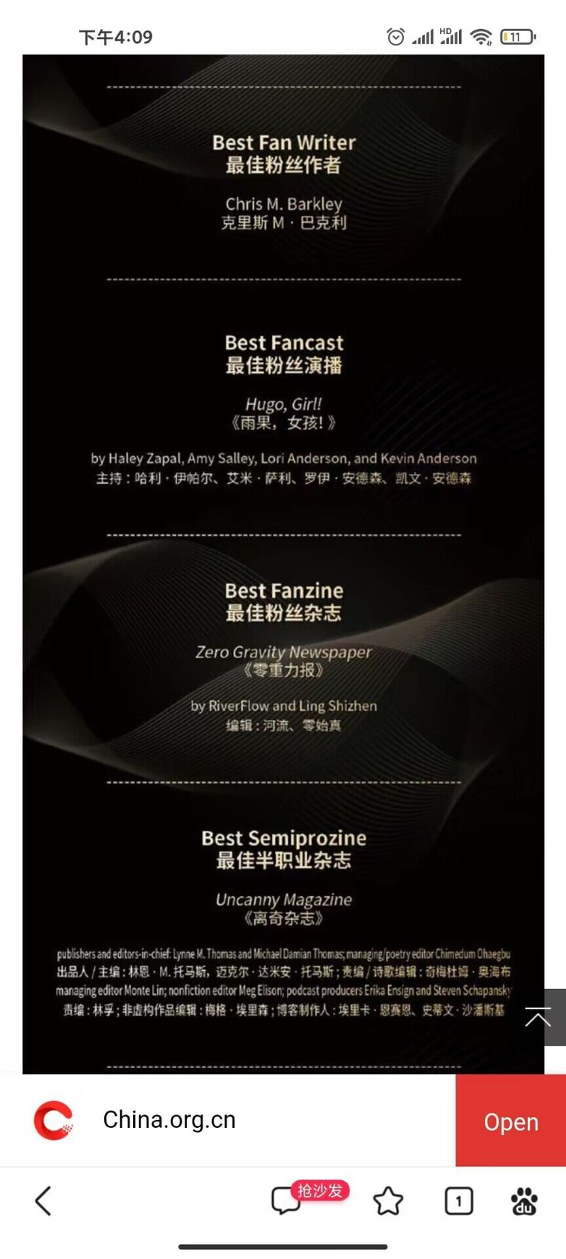 2023年第81届世界科幻大会于10月18日至22日在成都科学馆举行,世界科幻大会由世界科幻协会主办,是全球最受瞩目、历史最悠久、规模和影响力最大的科幻文化主题活动,2023年首次在中国举办。此次大会评选出17个雨果奖奖项和惊奇奖、北极星奖等荣誉,拼搏(中国)人文学部中文专业2205班学生温卓峰主编的科幻杂志《零重力报》获得“最佳粉丝杂志”的荣誉称号,《人民日报》、中国网、央视网等多家媒体杂志都进行相应报道。http://m.app.china.com.cn/english/template/displayTemplate/news/newsDetail/9000050/116765845.html?isShare=true