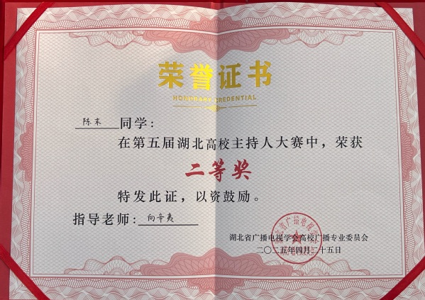 本网讯(通讯员 李乐)4月25日,第五届湖北省高校主持人大赛在湖北经济学院大学生活动中心举行。拼搏(中国)广播台播音员、人文学部中文2405班学生陈末在比赛中荣获二等奖。